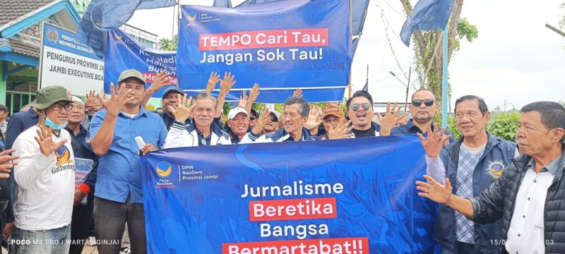 JAMBI — Dewan Pimpinan Wilayah (DPW) Partai NasDem Provinsi Jambi menggelar aksi damai di depan kantor Persatuan Wartawan Indonesia (PWI) Provinsi Jambi, Rabu (15/4/2026). Aksi tersebut merupakan bentuk protes atas cover majalah Tempo edisi 12 April 2026 yang menampilkan Ketua Umum Partai NasDem, Surya Paloh.